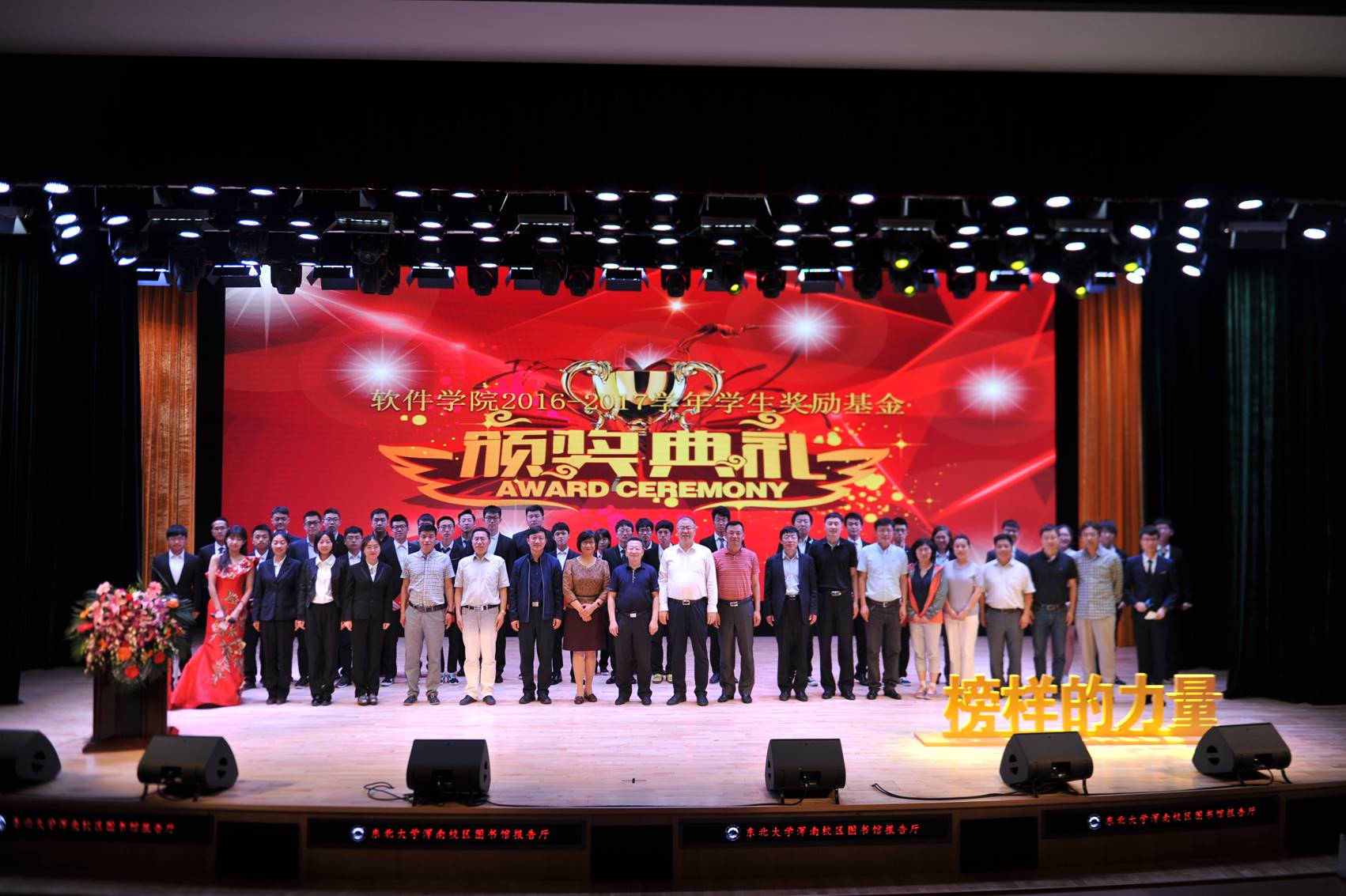 在颁奖典礼环节,对获得2016-2017学年学生奖励基金的获奖者进行了表彰,表彰科技竞赛奖、知识竞赛奖、学术论文奖、软件成果奖、优秀学生标兵奖、学业优秀奖、黑马奖、跃升班级奖、优秀新生奖,表彰个人540人次、1个班集体,奖励金额共计76.8万元。表彰10名辽宁华鼎科技股份有限公司设立的华鼎科技奖学金获奖者,奖励金额5万元。