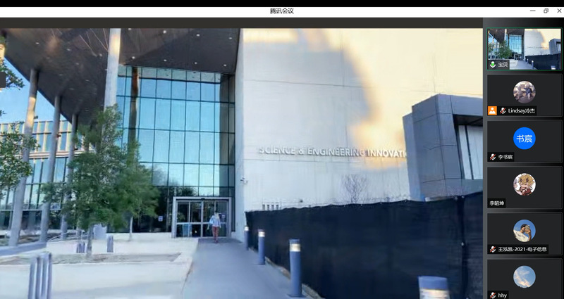 游览正式开始前,主持人Huiyang为同学们介绍了UTA和合作学院工学院的基本情况以及本次游览路线,随后通过直播的方式带领同学们身临其境、全方位地游览UTA校园。从工学院的新址Science & Engineering·Innovation & Research Building(SEIR)出发,Huiyang带领同学们参观了学院的实验室、教室以及教工的办公室,随后游览了学校的图书馆、学生活动中心、体育馆、健身房、餐厅等公共区域,与此同时对比中美高校和学生的差异,详细介绍了学生在美国的学习和生活情况。随着游览接近尾声,同学们畅所欲言,积极向Huiyang就生活及学术方面提出疑问。Huiyang逐一解答,并从提升英语水平、专业能力以及未来从业发展等方面给出了宝贵的意见和建议,提议同学们应多关注行业前沿会议及相关文献,寻找自己的兴趣所在,有机会多多参加项目,紧跟行业发展脚步,结合现实需求磨练自身本领。