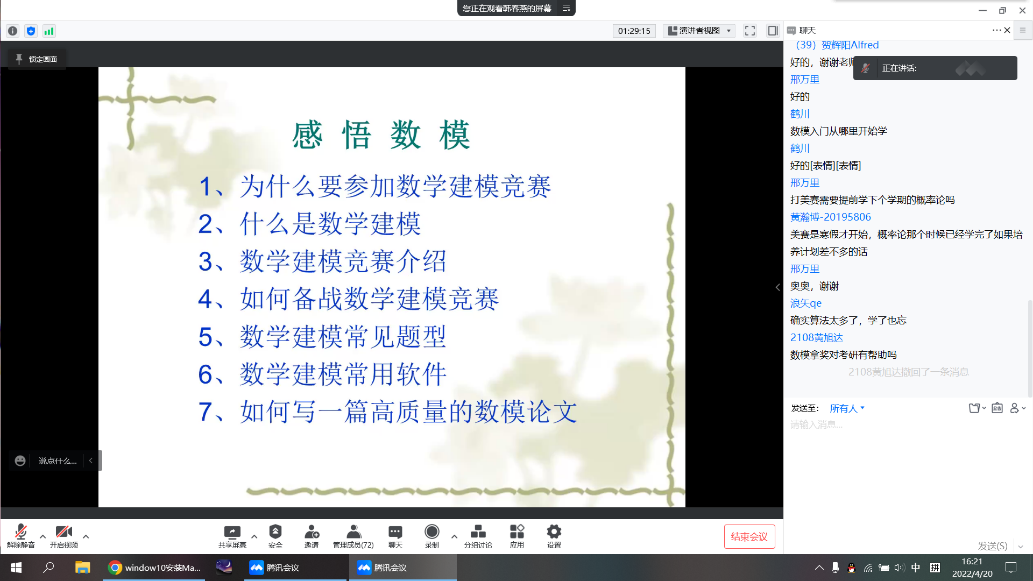 4月20日15时,永利集团304am登录“精英讲堂·半月谈”活动通过腾讯会议线上举行。讲座以“感悟数模”为主题,活动邀请永利集团304am登录副教授韩春燕担任主讲嘉宾,120余名学生收看讲座。