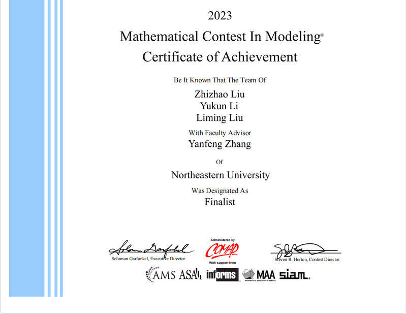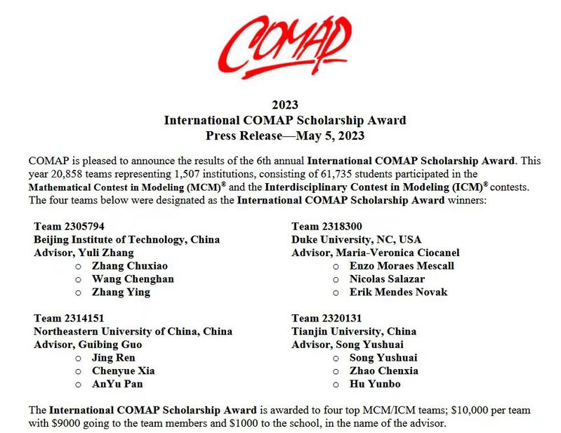 近日,2023年国际(美国)大学生数学建模竞赛(MCM/ICM)成绩揭晓,永利集团304am登录喜获佳绩,取得历史性突破。本届大赛我院获O奖(特等奖)1项,F奖(特等奖提名奖)4项,M奖(一等奖)10项,H奖(二等奖)45项。学生获奖人数占全校获奖人数的26.54%,获奖数量和质量均创历史新高。