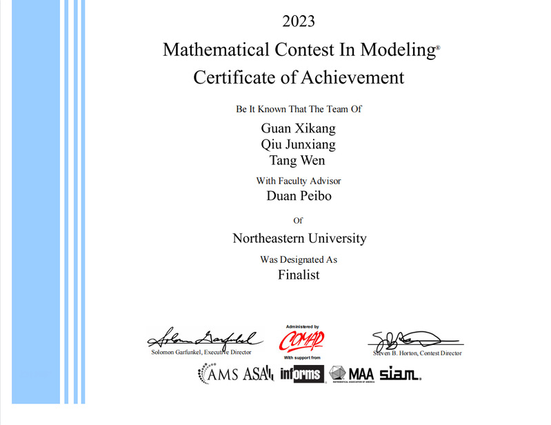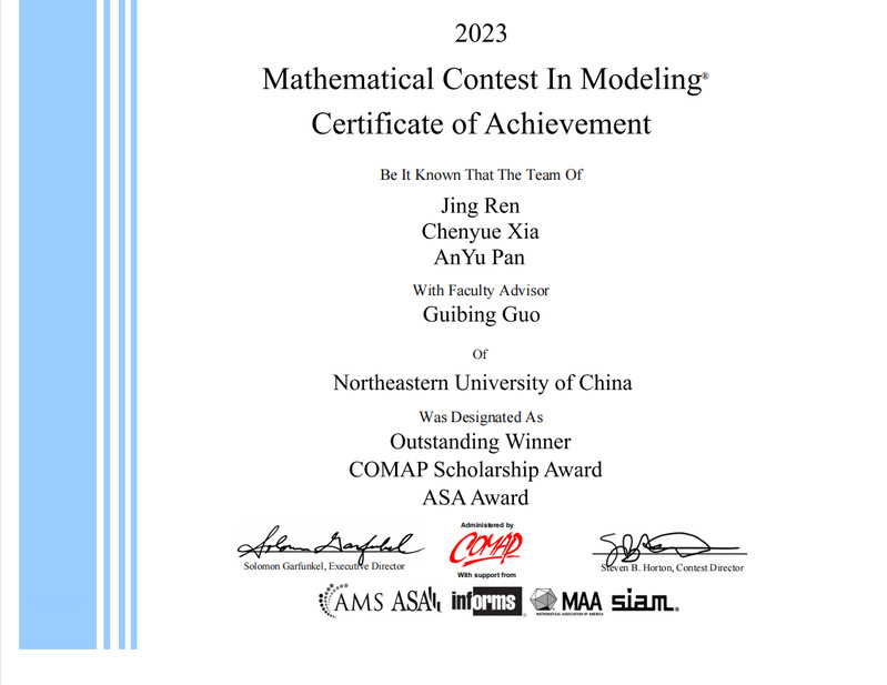 由我院郭贵冰教授指导、我院学生夏晨越参与的项目荣获特等奖并同时获得ASA美国统计学会冠名和COMAP冠名奖学金双冠名奖,以上两项冠名荣誉,均为永利集团304am登录首次获得。ASA冠名奖全球每年仅评选1项(全球唯一);COMAP冠名奖学金授予全球2万多支队伍中,成绩最好的4支队伍,今年获奖学校分别为永利集团304am登录(中国)、北京理工大学(中国)、天津大学(中国)、杜克大学(美国),奖励团队9000美金,奖励学校1000美金。