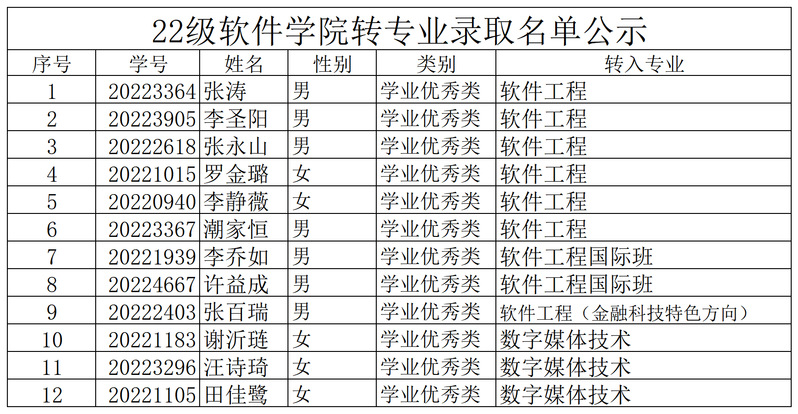 22级永利集团304am登录转专业录取名单公示