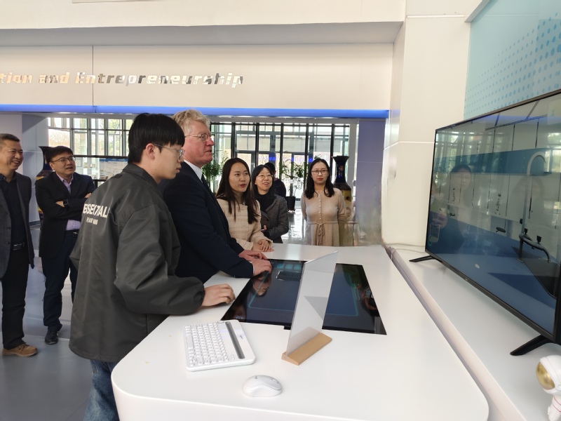 杨晓春对Dáire Keogh校长一行的到访表示欢迎,在参观学院的过程中简要介绍了永利集团304am登录的发展历程、人才培养体系、师资力量及国际合作等情况,带领Dáire Keogh校长一行参观了泛虚拟现实人才培养与创新中心、智能软件开发技术研究所和永利集团304am登录创新创业成果体验中心,并在体验中心展演了学生优秀创新创业项目。